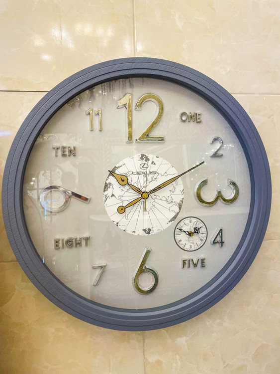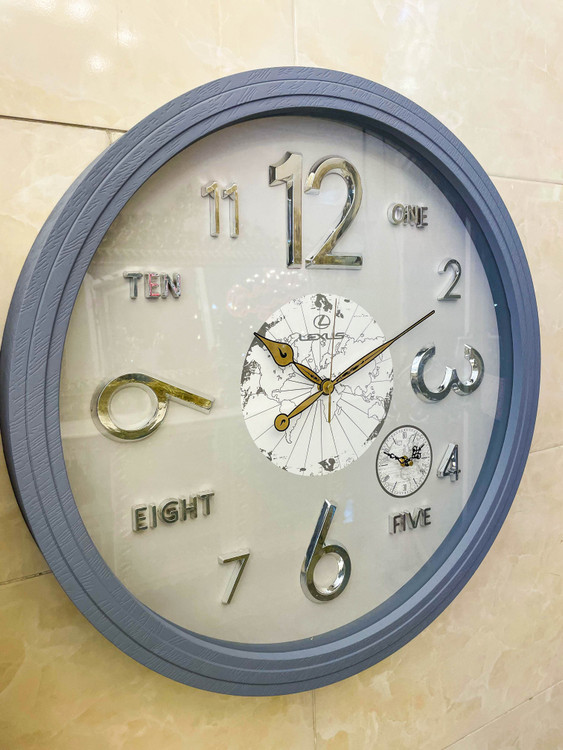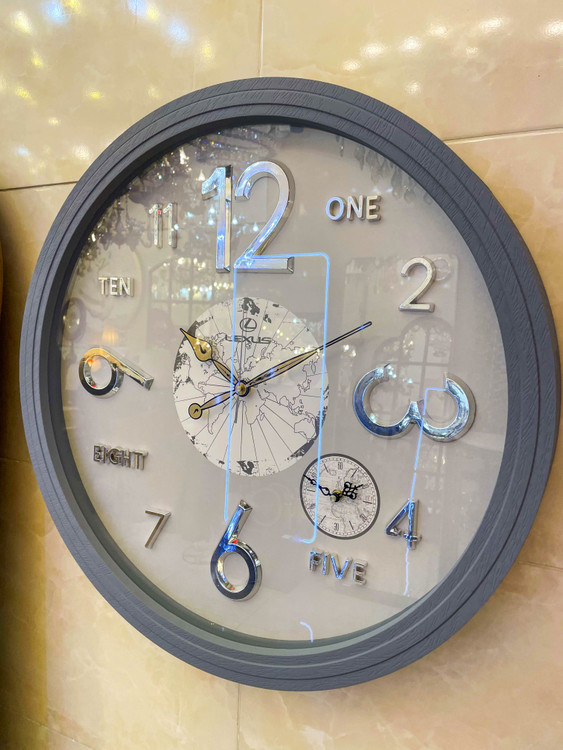 ساعت دیواری لکسوس در رنگ بندی طوسی عرضه شده است. در این رنگ طرحی ناقص اما جذاب از کره زمین اجرا شده که باعث زیبایی بیشتر صفحه می شود.